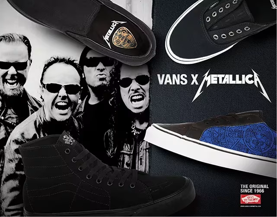 Vans collaborates with rock band Metallica. Each Metallica member - James Hetfield, Lars Ulrich, Kirk Hammett and Robert Trujillo - designs his own shoe and collaborates with Vans athletes including Pat Moore, Steve Caballero, Nathan Fletcher and Tony Trujillo for a special OffTheWall.TV series further defining what is means to be a part of the Vans family.